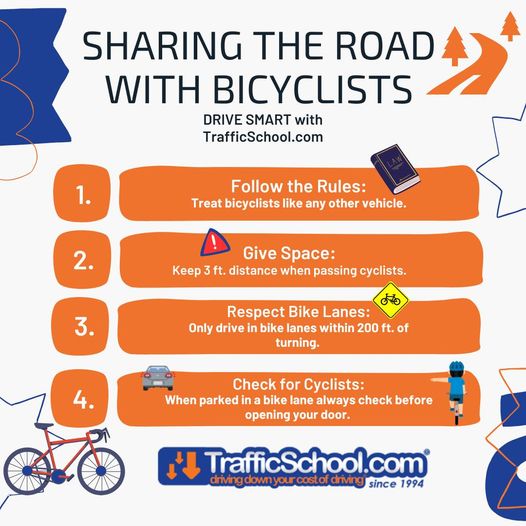 1. Follow the Rules: Bicyclists follow the same road rules as motorists. Treat them as you would any other vehicle.
