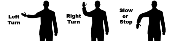 Right Turns: Driver’s left arm stretched out of the driver’s side window and bent upward at the elbow, with hand and fingers pointed toward the sky. (It should be noted that bicyclists may indicate a right turn by extending their right arm straight out to the right side of the bicycle.)
